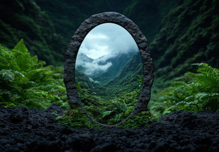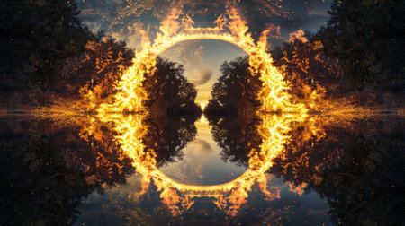 A science fiction graphic design concept of a glowing portal. With a mysterious figure mirrored in a misty spooky landscape at night.