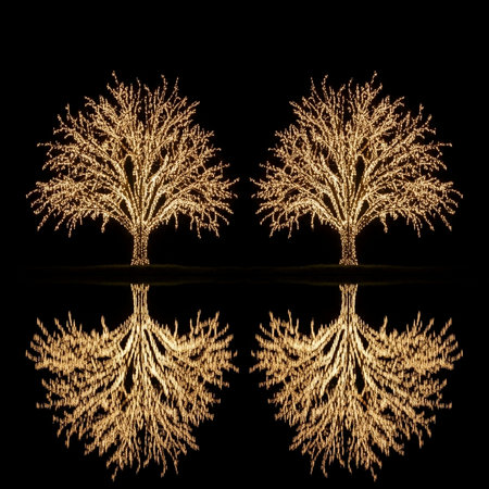 Reflective portrait of woman with soft bokeh lights in urban setting.