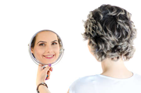 Portrait of woman smiling with make-up reflection look in small mirror isolated on white background