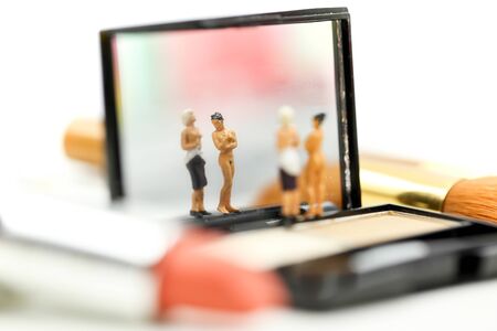Miniature people : beautiful woman and friend with Makeup products with cosmetic beauty products.