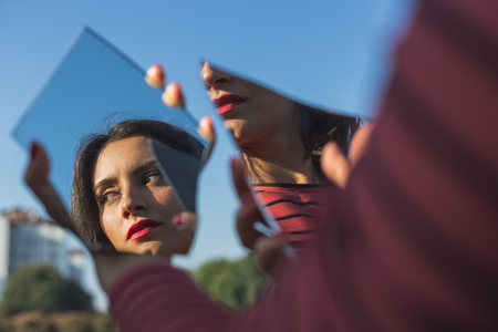 Beautiful girl holding a broken mirror with reflection of her beautiful face.Beauty and fashion shoot.Close up.