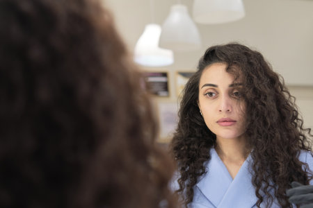An Indian esthetician, her curly hair cascading, ponders her reflection in the mirror. Behind her, certificates testify to her profound expertise.