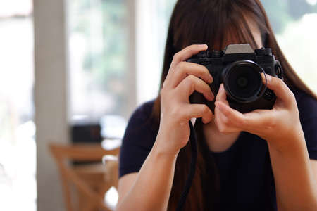 hipster girl holding camera and taking photo. closeup of hand of young woman with professional camera in studio. world photography day concept