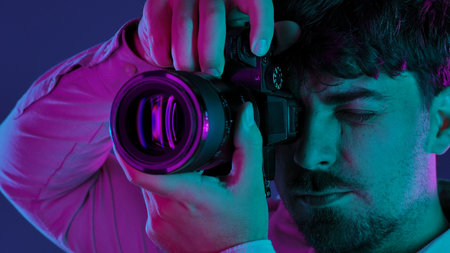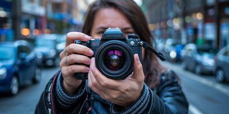 Photographer taking picture with professional camera on city street