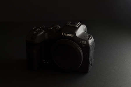 Milan, Italy - August 13, 2022: close up on Canon EOS R7 mirrorless camera in a studio environment. No people are visible.