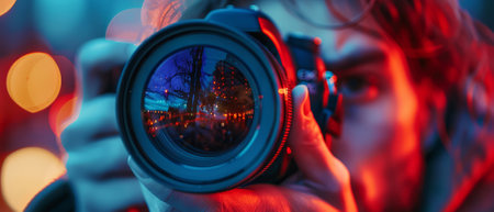 Photographer taking photo with DSLR camera at night with bokeh light background