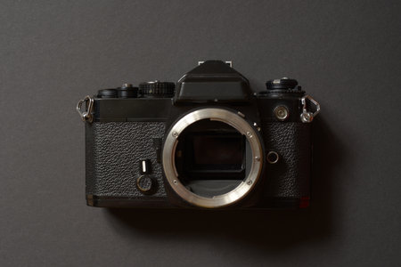 Old SLR film camera and a lens on black background, Photography Concept.