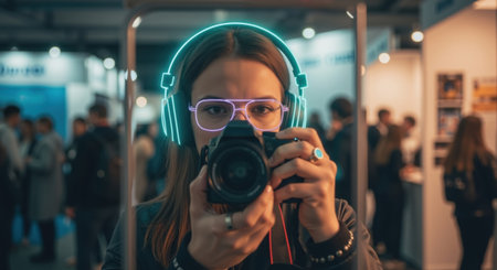 Woman with digital neon headphones and glasses taking photo with camera. Young photographer capturing moment in virtual reality. International Youth Day concept.