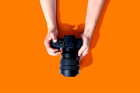 Professional woman photographer hold modern model of camera