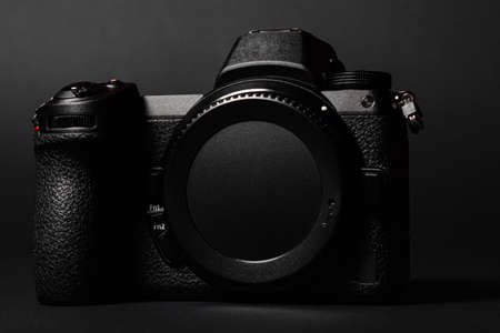 Mirrorless camera with large mount and sensor stabilization, front view. 2021.