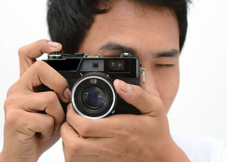 A young man takes a photo with a vintage film camera.