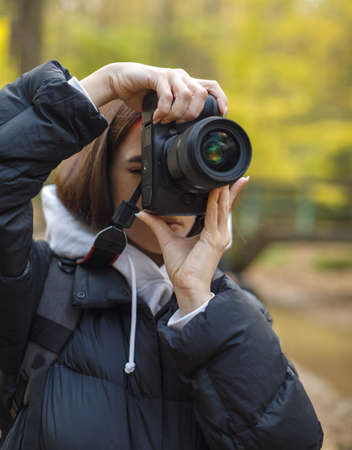 young nice woman photographer taking photo outdoors in nature