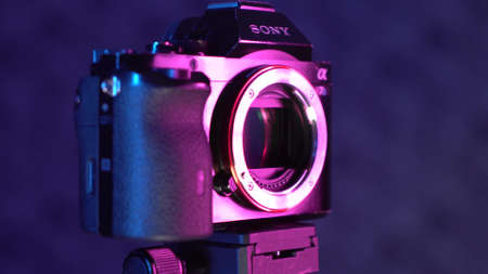 Moscow, Russia, 18 02 2020: Old Sony A7S footage without lens. We see a little bit dirty matrix with dust on it.