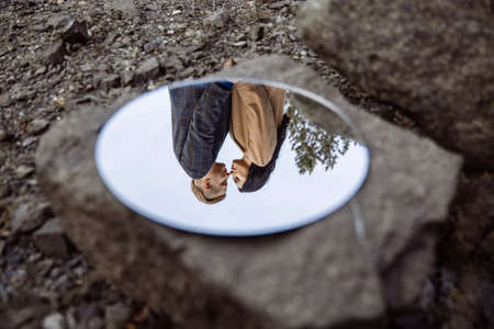 Reflection in the mirror of pair of woman and man who are closely tilted to each other. The mirror lies on large stone.