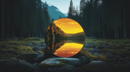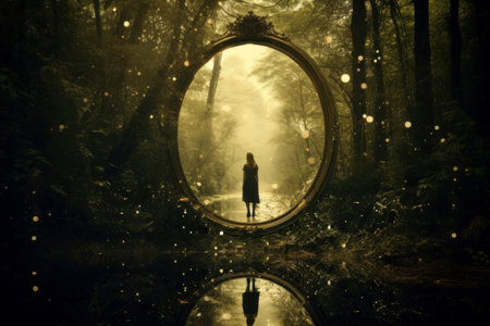 Mystical scene with a silhouetted figure within a mirror reflecting a lush forest