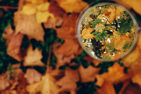 Colorful orange autumn background of fallen autumn maple leaves and round mirror with reflection of trees