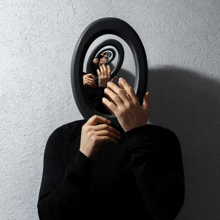 Enigmatic surrealistic optical illusion, young man holding round frame on textured grey background. Contemporary artwork collage concept.