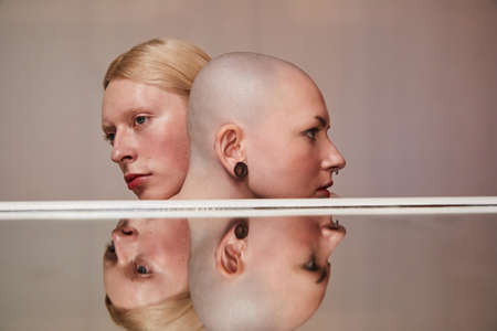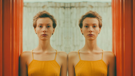 Generative AI : face of young beautiful healthy woman and reflection in the mirror