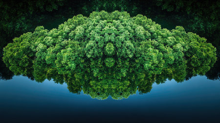 The reflection showcases rolling hills and vibrant greenery, creating a tranquil atmosphere against a blank backdrop.