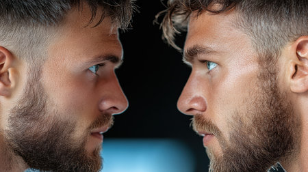 A young man sits in front of a mirror. gazing at his reflection. The image evokes contemplation. introspection. and the search for self identity.
