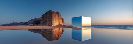 Mirrored Cube Reflecting AlUla Desert Sands and Sea, Creating a Stunning Optical Illusion Art.