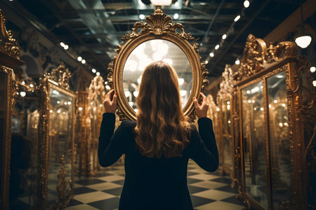 Person holding a decorative mirror admiring their reflection while shopping. Concept Fashion Photography, Mirror Reflection, Shopping Adventure