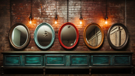 Depict a collection of antique mirrors, reflecting distorted perspectives on a wall, portraying self-image issues --chaos 30 --ar 16:9 --v 6.1 Job ID: 98ac2c6a-cc41-4177-8f6b-352a94fac825