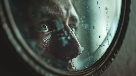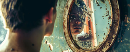 A contemplative figure gazes into a weathered mirror, reflecting emotions and thoughts in an abandoned setting.