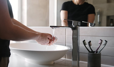Woman In The Mirror Reflection Washing Her Hands In The Bathroom