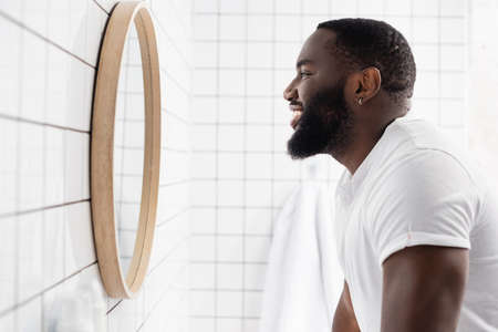 Smile, mirror and man in bathroom, skincare and grooming with wellness, morning routine and glow. Reflection, home and person with happiness, healthy skin and confidence with shine and dermatology