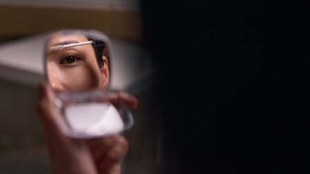 Woman shaping eyebrows while looking into small mirror. Concept of daily beauty routine, personal grooming, skincare habits, selfcare lifestyle and cosmetic marketing.