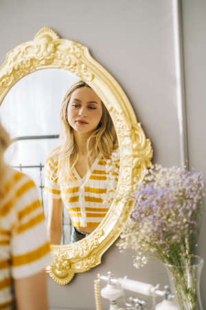 Young attractive caucasian woman looking in the mirror at her face, beauty treatment, skin care concept.