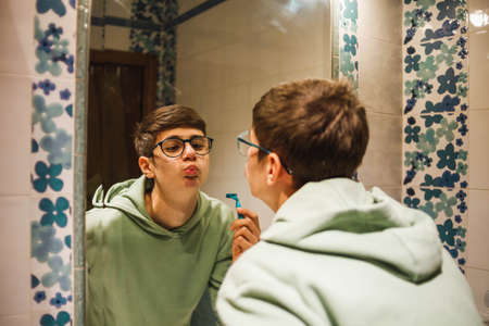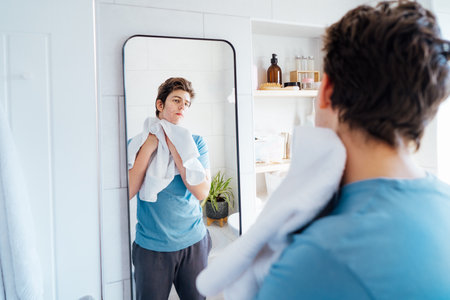 Concentrated caucasian teenage boy with acne problem takes care of his face skin at home. He looking in mirror and wipes face with towel in bathroom. Teenager skin care every day treatment process.