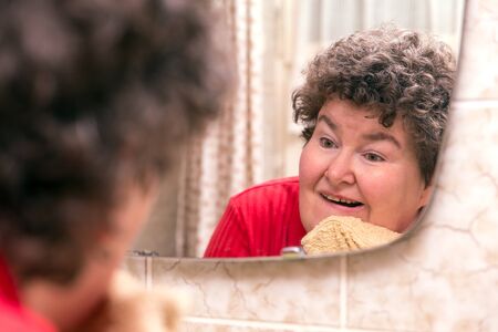 Woman with curly hair examines red inflammations on her face in the mirror. Concept Skincare Routine, Curly Hair Tips, Redness & Inflammation, Mirror Self-Care, Facial Examinations