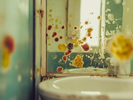 A bathroom scene featuring a mirror with colorful stains and imperfections, creating a unique abstract aesthetic.