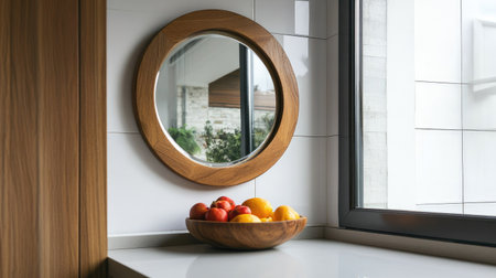 A mirror with a wooden frame on a kitchen wall, reflecting a bowl of fruit on the counter