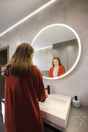 Young woman in a red robe washing her hands while looking down in front of a round illuminated mirror in a modern bathroom.