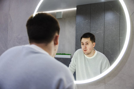Sleepy and surprised young man looks at his reflection in a round illuminated mirror, standing in a modern bathroom during a morning routine.