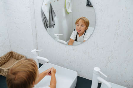 Grimacing in a mirror little boy washing his hands in the bathroom sink. He's sticking his tongue out. From behind his shoulder.