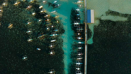 aerial view many boats in the turquoise lagoon, view from above. Seascape with blue bay and boats. traditional Filipino wooden outrigger boat called a banca. Summer and travel vacation concept