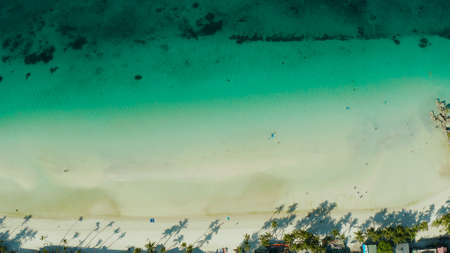 White Beach of Boracay and people swim at turquoise azure sea near Grotto Willys Rock upon which stands the Virgin Mary Statue. Copy space for text. Summer and travel vacation concept.