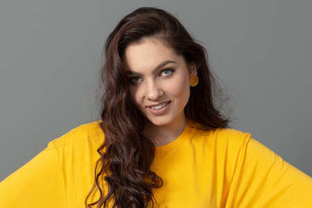 portrait of a young teenager with long wavy hair dressed in a yellow t-shirt, isolated on gray