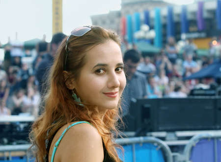 Girls with hands up dancing, singing and listening the music during concert show on summer music festival