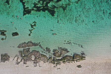 Aerial view of tropical sandy beach and blue ocean with crystal clear turqouise water. Abstract summer background.