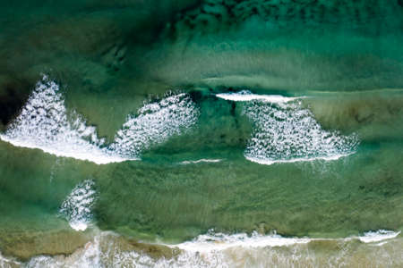 An aerial perspective showcases ocean waves in shades of deep blue and white foam. The image captures the movement and texture of water, with visible patterns of waves. This composition, likely taken from above, depicts a dynamic scene suitable for various commercial and editorial applications, emphasizing natural elements.