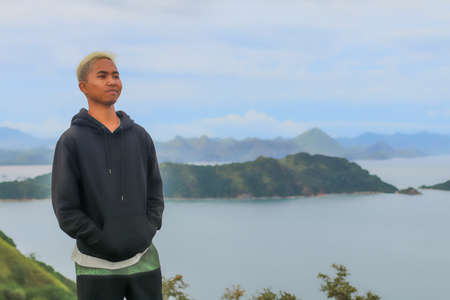 Portrait of young man on the top of hill wearing black jacket with the sea background in Labuan Bajo