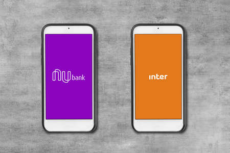 Brusque / SC / Brasil - 08/31/2020: Nubank and Banco Inter logos on the screen of the mobile device. Nubank vs Inter.