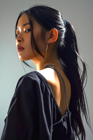 Stylish young woman with long dark hair posing in fashionable black shirt, showcasing modern elegance and confidence