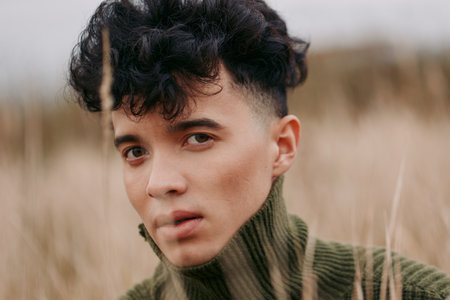 Close natural portrait of a young man in a knit turtleneck, capturing quiet gaze and authentic facial details with accurate skin tones and tactile texture in soft outdoor light.