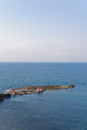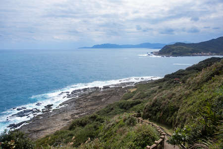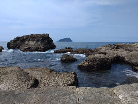 Landscape of blue sea, mountains and textured rocks. Hazy dreamy sky. Longdong is a paradise for viewing sea views in the north of Taiwan.